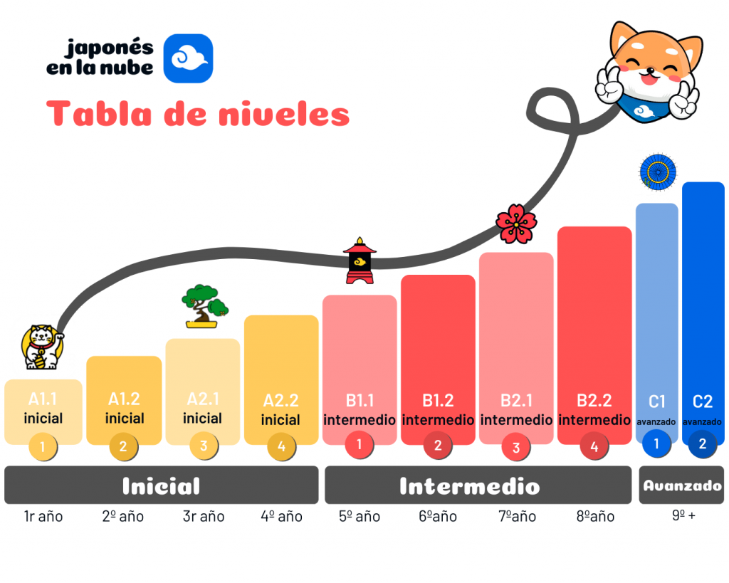 En Japonés en la Nube seguimos la escala de niveles marcada por el MECR (Marco Común Europeo de Referencia para las Lenguas), el cual divide los estadios del aprendizaje de lenguas en los niveles A1 y A2 (inicial), B1 y B2 (intermedio) y C1 y C2 (avanzado). Siguiendo esta escala, la escuela se estructura en varios cursos por nivel, que puedes ver reflejados en la tabla adjunta.